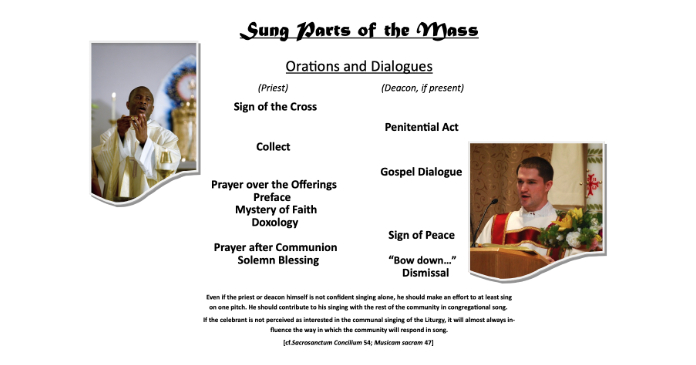 The dialogue of the priest, the deacon, and the faithful is among the most important musical parts of the Mass. The Order of the Mass is the fundamental and primary song of the liturgy. It forms the part of the Mass that is of the greatest importance, and therefore it should be sung ideally before any of the other parts of the Mass are sung.